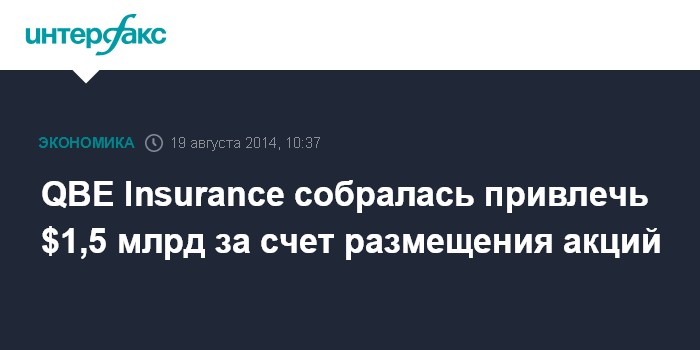 Москва. 19 августа. INTERFAX.RU - Крупнейший австралийский страховщик по объему премий QBE Insurance Group Ltd. планирует привлечь $1,5 млрд за счет размещения акций, а также продажи отдельных активов, сообщает агентство Bloomberg.