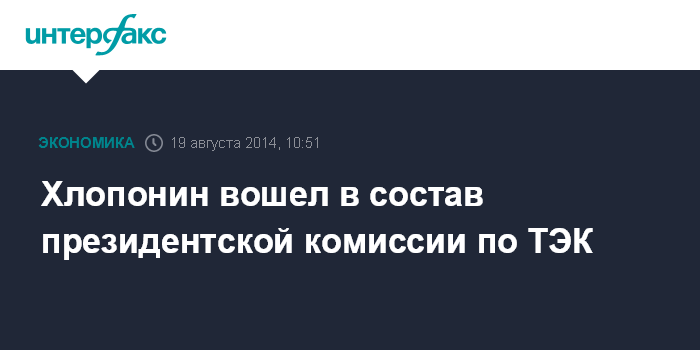 Москва. 19 августа. INTERFAX.RU - Вице-премьер РФ Александр Хлопонин включен в состав комиссии при президенте РФ по вопросам стратегии развития топливно-энергетического комплекса и экологической безопасности. Соответствующий указ 18 августа подписал президент Владимир Путин.