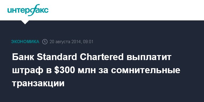 Москва. 20 августа. INTERFAX.RU - Британский банк Standard Chartered Plc оштрафован банковским регулятором Нью-Йорка на $300 млн за то, что не смог разрешить ситуацию с "сомнительными транзакциями", сообщает BBC News.