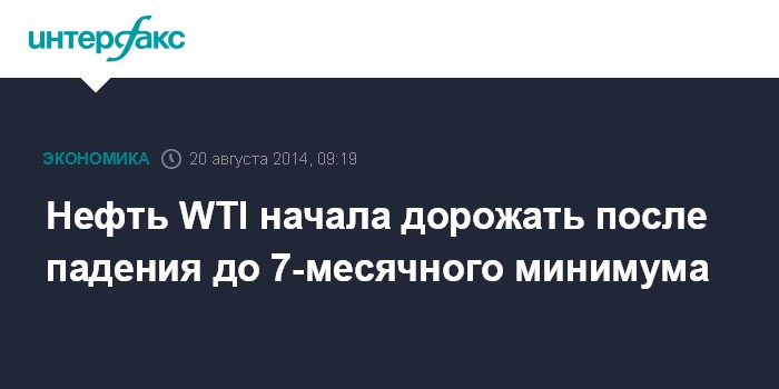 Москва. 20 августа. INTERFAX.RU - Цены на нефть на мировых рынках изменяются разнонаправленно с утра в среду: Brent почти стабильна, тогда как WTI дорожает после падения накануне до самой низкой отметки за 7 месяцев.