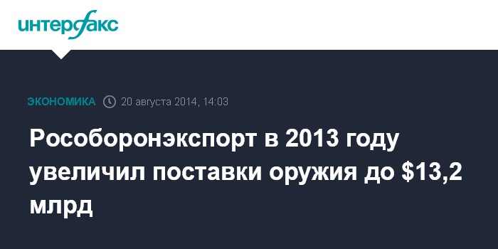 Москва. 20 августа. INTERFAX.RU - "Рособоронэкспорт" в 2013 году поставил на экспорт вооружения и военную технику на $13,2 млрд, говорится в годовом отчете компании. Это на 2,15% больше, чем в 2012 году. Доля "Рособоронэкспорта" в общем объеме всего российского экспорта данной продукции составила около 83%.