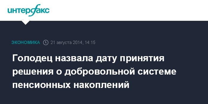 Москва. 21 августа. INTERFAX.RU - Решение о переходе на добровольную систему пенсионных накоплений должно быть принято до середины сентября текущего года, считает вице-премьер Ольга Голодец. По ее словам, сейчас этот вопрос обсуждается.