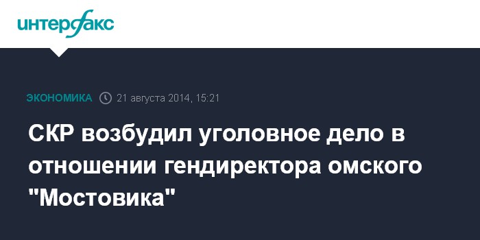 Москва. 21 августа. INTERFAX.RU - Следственный комитет возбудил уголовное дело в отношении генерального директора омского ООО "Мостовик" Олега Шишова, сообщили "Интерфаксу" в пресс-службе СУ СКР по Омской области. Дело возбуждено по ч.4 ст.159 УК РФ - "мошенничество, сопряженное с преднамеренным неисполнением договорных обязательств в сфере предпринимательской деятельности в особо крупном размере".