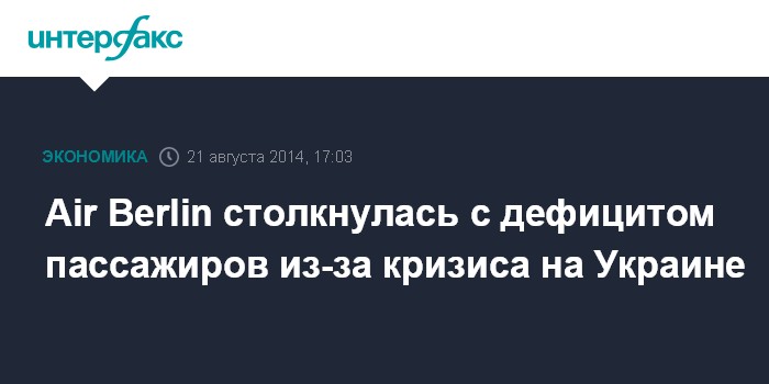 Москва. 21 августа. INTERFAX.RU - Вторая по величине немецкая авиакомпания Air Berlin сообщила в четверг о падении спроса на российском и украинском рынках и не исключила снижения перевозок.