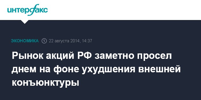 Москва. 22 августа. INTERFAX.RU - Рынок акций РФ к средине дня в пятницу заметно просел в рамках коррекции после двухнедельного роста на фоне наметившегося ухудшения ситуации на мировых рынках капитала.