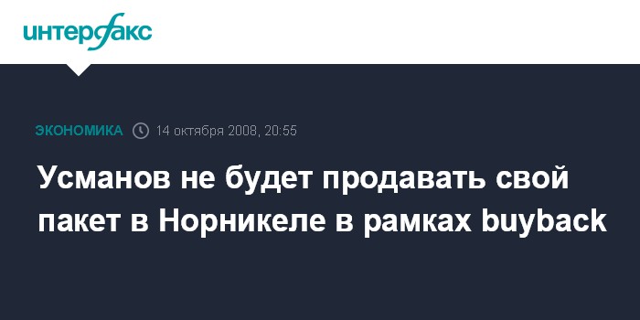 Москва. 14 октября. INTERFAX.RU - Совладелец холдинга "Металлоинвест" Алишер Усманов не будет продавать свой пакет в ОАО "ГМК "Норильский никель" в рамках процедуры buyback, которую проводит компания.