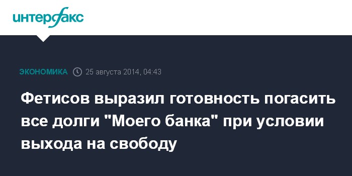 Москва. 25 августа. INTERFAX.RU - Бывший сенатор и владелец "Моего банка" Глеб Фетисов направил письмо Агентству по страхованию вкладов (АСВ, конкурсный управляющий банка), в котором изъявил готовность из своих средств погасить все его долги на сумму почти 14 млрд рублей в самом начале банкротства, сообщает "Коммерсант" в понедельник.