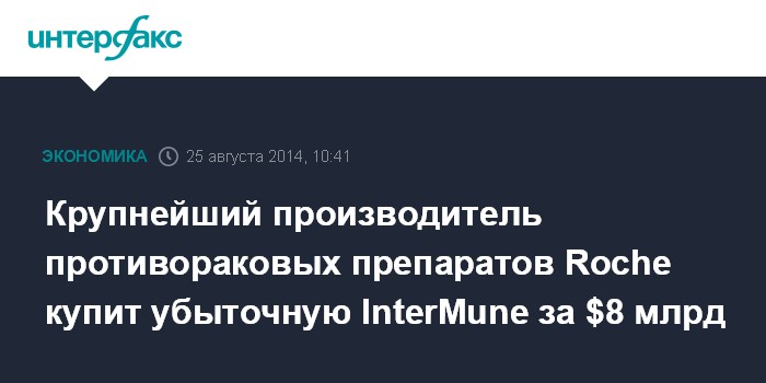 Москва. 25 августа. INTERFAX.RU - Швейцарская Roche Holding AG, крупнейший мировой производитель противораковых средств, покупает убыточную биотехнологическую компанию InterMune Inc. (США) за $8,3 млрд, чтобы расширить портфель препаратов для лечения болезней органов дыхания.