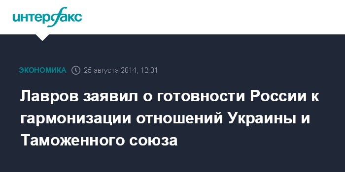 Москва. 25 августа. INTERFAX.RU - Россия выступает за поиск гармонизации в отношениях между Украиной, Таможенным союзом, зоной свободной торговли СНГ и с ЕС по экономическим вопросам, заявил глава МИД РФ Сергей Лавров.