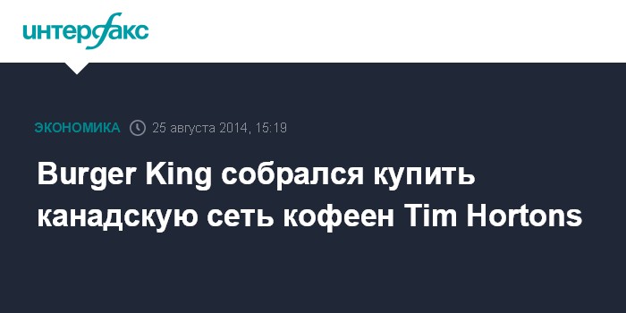 Москва. 25 августа. INTERFAX.RU - Сеть ресторанов быстрого питания Burger King Worldwide Inc. подтвердила, что ведет переговоры о слиянии с крупнейшей канадской сетью закусочных Tim Hortons Inc., планируя затем перенести штаб-квартиру из Флориды в Канаду.