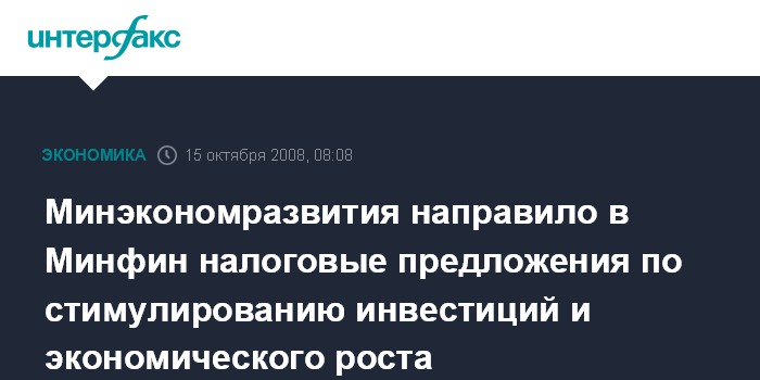 Москва. 15 октября. INTERFAX.RU - Минэкономразвития РФ в начале недели направило в Минфин проект федерального закона, содержащий ряд стимулирующих экономический рост и инвестиционную активность мер.