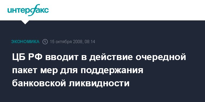 Москва. 15 октября. INTERFAX.RU - Совет директоров Банка России во вторник утвердил очередной пакет мер, направленных на стабилизацию ситуации на внутреннем финансовом рынке и поддержания ликвидности российского банковского сектора, они начинают действовать с 15 октября.