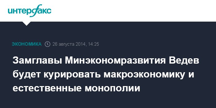 Москва. 26 августа. INTERFAX.RU - Новый заместитель министра экономического развития России Алексей Ведев, назначенный в августе, будет курировать в министерстве макроэкономические вопросы, а также контроль за естественными монополиями и тарифами.