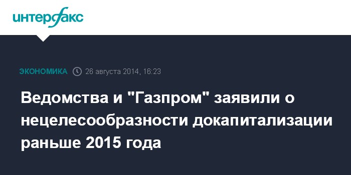 "Вопрос проработан Минэкономразвития. По мнению федеральных органов исполнительной власти и самого "Газпрома", докапитализация раньше 2015 года нецелесообразна", - сообщили "Интерфаксу" в пресс-службе министерства экономического развития.