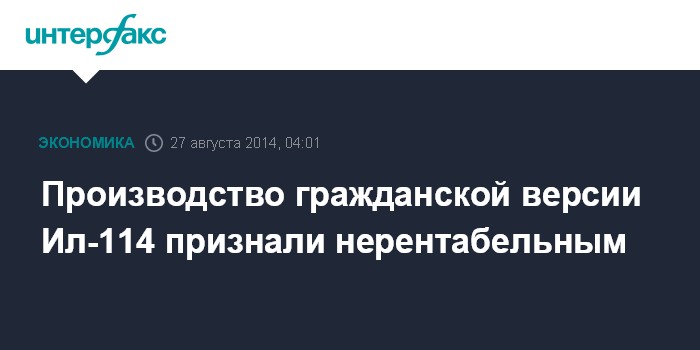 Москва. 27 августа. INTERFAX.RU - Возобновление производства гражданской версии регионального самолета Ил-114 нерентабельно. Об этом, как пишет "Коммерсант", заявил заместитель главы Минпромторга Юрий Слюсарь.