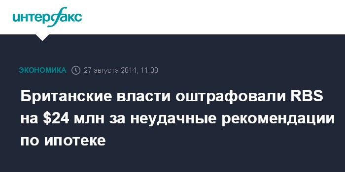 Москва. 27 августа. INTERFAX.RU - Британские власти оштрафовали Royal Bank of Scotland Group Plc на 14,47 млн фунтов стерлингов ($24 млн) в связи с неудачными рекомендациями, которые банк давал своим клиентам - физическим лицам в отношении жилищной ипотеки.