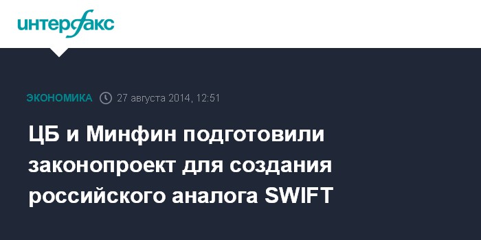 Москва. 27 августа. INTERFAX.RU - ЦБ РФ и Минфин подготовили законопроект, создающий российский аналог межбанковской системы передачи информации и совершения платежей SWIFT, сообщил замминистра финансов Алексей Моисеев журналистам в среду.