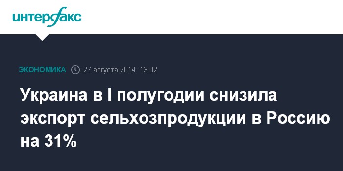 Москва. 27 августа. INTERFAX.RU - Экспорт украинской сельскохозяйственной продукции в Россию в январе-июне 2014 года сократился на 31% по сравнению с аналогичным периодом прошлого года, сообщает пресс-служба министерства аграрной политики и продовольствия. За шесть месяцев экспорт составил $1,011 млрд.