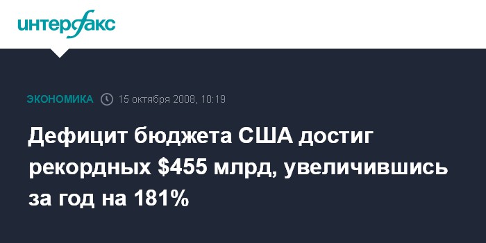 Дефицит бюджета США по итогам года составил $455 млрд по сравнению с $162 млрд годом ранее. Предыдущий рекорд был поставлен в 2004 году и составлял $413 миллиардов. Таким образом, дефицит составил 3,2% ВВП США по сравнению с 1,2% ВВП в 2007 финансовом году.