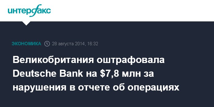 Москва. 28 августа. INTERFAX.RU - Управление по контролю за соблюдением норм поведения на финансовых рынках (FCA) Великобритании оштрафовало Deutsche Bank, крупнейший инвестбанк Европы, на 4,7 млн фунтов стерлингов ($7,8 млн) за предоставление неверных сведений о проведенных операциях, сообщает агентство Bloomberg.