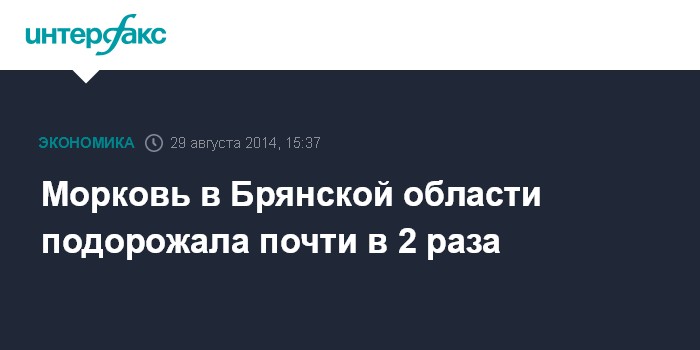 Москва. 29 августа. INTERFAX.RU - Брянская область стала лидером по росту цен на картофель и морковь. Если в целом по стране картофель за время проводимого Минсельхозом мониторинга подешевел на 18,1%, то в Брянской области цены на него взлетели сразу на 40%. Цены на морковь в среднем по стране снизились на 12,7%, а в Брянской область – выросли почти в 1,9 раза.