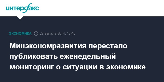 Москва. 29 августа. INTERFAX.RU - Минэкономразвития решило прекратить публикацию еженедельного мониторинга о ситуации в экономике РФ, который ведомство обычно размещало у себя на сайте по пятницам. В пресс-службе ведомства "Интерфаксу" объяснили это решение техническими моментами.