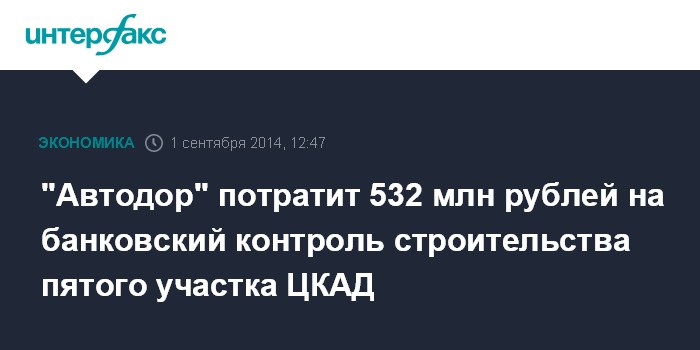 Москва. 1 сентября. INTERFAX.RU - "Автодор" объявил открытый одноэтапный конкурс по выбору исполнителя услуги обязательного банковского сопровождения и строительного контроля для первой очереди строительства пятого участка ЦКАД. Начальная (максимальная) цена договора с учетом НДС: 531 млн 784 тыс. 900 рублей, в том числе услуга обязательного банковского сопровождения 1 тыс. рублей и услуга строительного контроля 531 млн 783 тыс. 900 рублей, говорится в материалах на сайте госзакупок.