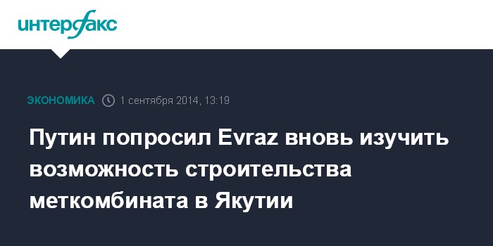 Москва. 1 сентября. INTERFAX.RU - Президент РФ Владимир Путин настоял на необходимости повторно изучить возможность строительства компанией Evraz plc в Якутии металлургического предприятия. Несколько лет назад компания признала его инвестиционно непривлекательным.