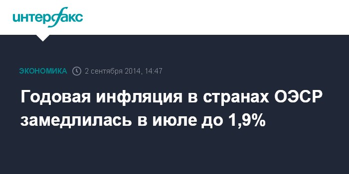 Москва. 2 сентября. INTERFAX.RU - Средний показатель инфляции в странах, входящих в Организацию экономического сотрудничества и развития (ОЭСР), в июле 2014 года составил 1,9% в годовом исчислении, замедлившись по сравнению с июньскими 2,1%, говорится в сообщении организации.