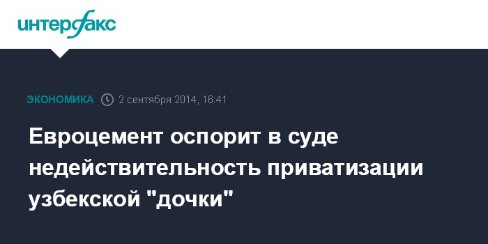 Москва. 2 сентября. INTERFAX.RU - Высший хозяйственный суд Узбекистана принял к рассмотрению апелляционную жалобу Российский холдинг "Евроцемент груп" подал апелляцию в Высший хозяйственный суд Узбекистана о признании недействительной приватизацию АО "Ахангаранцемент". Как сообщили "Интерфаксу" в суде, рассмотрение апелляции назначено на середину сентября.