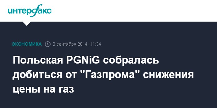 Москва. 3 сентября. INTERFAX.RU - Польская PGNiG планирует добиться от "Газпрома" большего снижения цены на газ, чем было обговорено два года назад, сообщает Bloomberg со ссылкой на председателя правления PGNiG Мариуша Завиша.