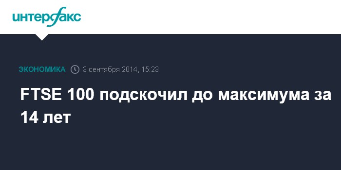 Москва. 3 сентября. INTERFAX.RU - Основной британский фондовый индекс FTSE 100 подскочил в среду до самой высокой отметки за 14 лет - 6897 пунктов - на позитивных макроэкономических данных и новостях о прекращении огня на востоке Украины, пишет Financial Times.