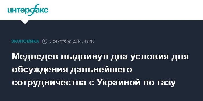 Москва. 3 сентября. INTERFAX.RU - Премьер-министр Дмитрий Медведев заявил о готовности России обсуждать пути возобновления сотрудничества с Украиной в газовой сфере как с государством-должником, однако при этом он выдвинул два условия.