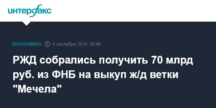 Москва. 4 сентября. INTERFAX.RU – В качестве рабочего варианта по выкупу ж/д ветки "Мечела" к Эльгинскому месторождению рассматривается возможность выделения средств ФНБ для "РЖД", заявил президент РЖД Владимир Якунин журналистам в кулуарах форума "Координационный совет по транссибирским перевозкам". По его словам, речь идет о 70 млрд рублей.