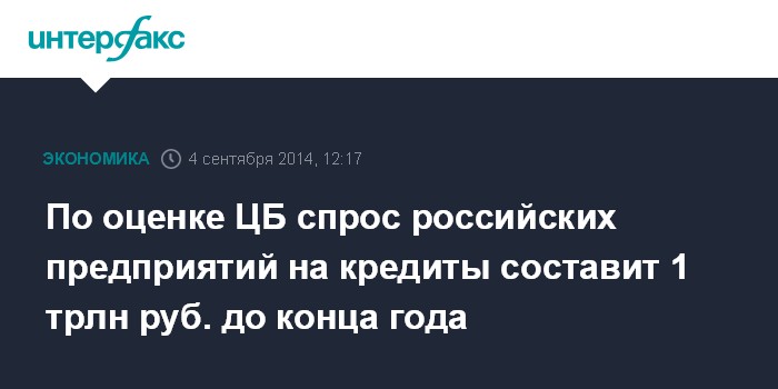 Москва. 4 сентября. INTERFAX.RU - Центробанк ожидает спрос на кредиты со стороны российских предприятий в размере до 1 трлн рублей до конца 2014 года, заявил зампред ЦБ РФ Михаил Сухов на форуме "Банки России - XXI век" в четверг.