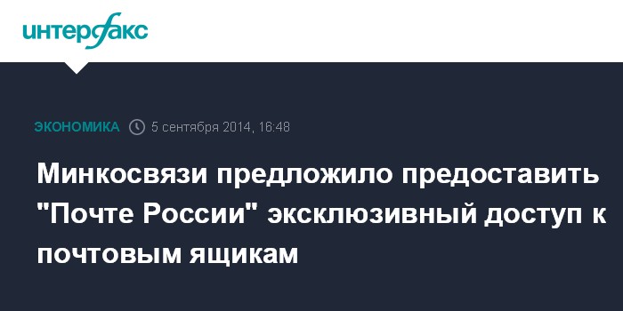 Москва. 5 сентября. INTERFAX.RU - Минкомсвязи предлагает предоставить "Почте России" эксклюзивный доступ к почтовым ящикам на территории страны.