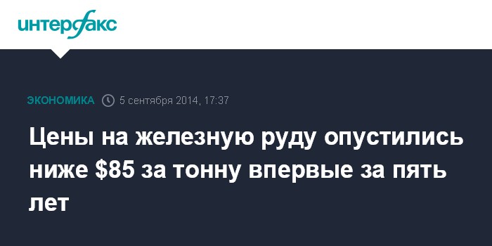 Москва. 5 сентября. INTERFAX.RU - Цены на железную руду в пятницу опустились ниже $85 за тонну впервые за пять лет, поскольку Китай, являющийся крупнейшим потребителем этого сырья, демонстрирует признаки ослабления экономического роста и спроса на руду, сообщает агентство Bloomberg.