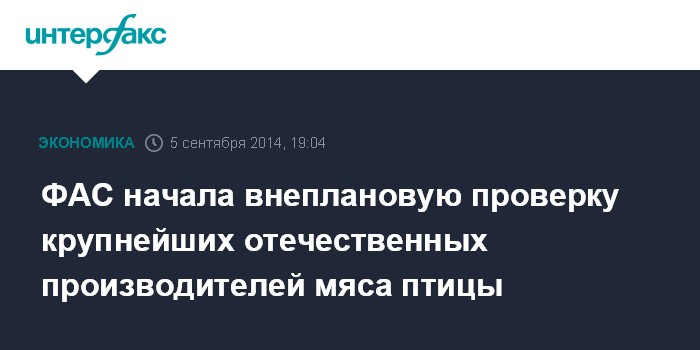 Москва. 5 сентября. INTERFAX.RU - Федеральная антимонопольная служба (ФАС) начала проведение внеплановых проверок в отношении крупнейших отечественных производителей мяса птицы, говорится в сообщении на сайте ведомства.