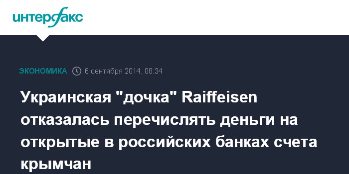 "Дело в том, что жители Крыма открывали текущие счета в нашем банке как граждане Украины, по украинским паспортам. По правилам, установленным Нацбанком Украины, граждане страны не могут открывать счета в иностранных банках, не получив предварительно специальное разрешение Нацбанка. Если вы открыли счет в российском банке без разрешения НБУ, мы не сможем сделать перевод на этот счет", - сказала "Интерфаксу" заместитель директора центрального офиса "Райффайзен банк Аваль" в городе Новая Каховка в Херсонской области, которая граничит с Крымом.