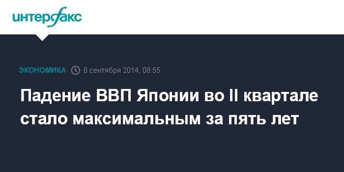Москва. 8 сентября. INTERFAX.RU - Оценка снижения ВВП Японии во втором квартале 2014 года пересмотрена в худшую сторону - до 7,1% в годовом выражении, свидетельствуют окончательные данные. Падение ВВП стало максимальным с первого квартала 2009 года.