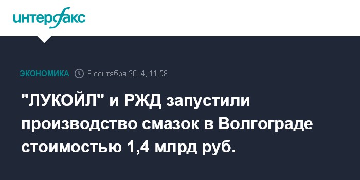 Москва. 8 сентября. INTERFAX.RU - Совместное предприятие "ЛУКОЙЛа" и "РЖД" - "Интесмо" - по производству смазок в понедельник введено в эксплуатацию в Волгограде, сообщил корреспондент "Интерфакса", присутствовавший на церемонии пуска предприятия. "ЛУКОЙЛ" инвестировал в создание производства 1,368 млрд рублей.