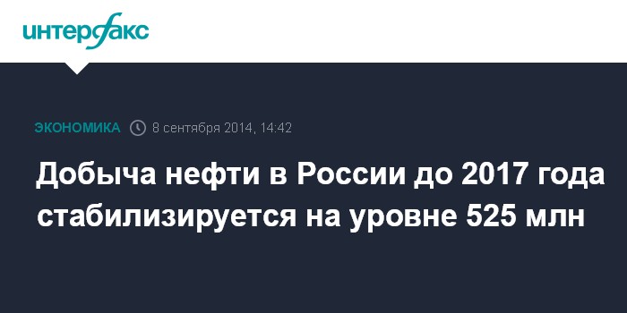 Москва. 8 сентября. INTERFAX.RU - Министерство энергетики прогнозирует стабилизацию добычи нефти в России до 2017 года на уровне 525 млн тонн в год.