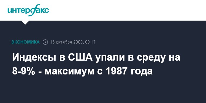 Москва. 16 октября. INTERFAX.RU - Фондовые индексы в США по итогам торгов в среду продемонстрировали рекордное снижение с 1987 года, опустившись на 8-9%, из-за негативной статистики, в частности, по розничным продажам в США в сентябре, сообщило агентство Bloomberg.