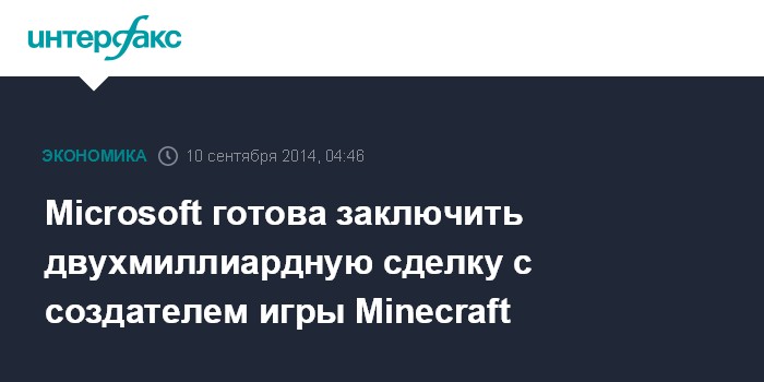 Москва. 10 сентября. INTERFAX.RU - Microsoft начала серьезные переговоры о покупке с компанией Mojang AB, шведским разработчиком популярной видеоигры Minecraft, сообщила газета The Wall Street Journal в среду со ссылкой на свои источники.