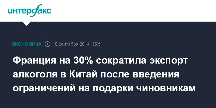 Москва. 10 сентября. INTERFAX.RU - Экспорт французских вин и крепких спиртных напитков резко снизился в первом полугодии 2014 года из-за падения спроса на элитный алкоголь на китайском рынке, пишет The Wall Street Journal. Падение спроса связано, прежде всего, с введенными ограничений китайского правительства, касающихся подарков дорогого алкоголя должностным лицам.