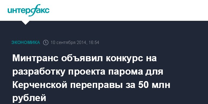 Москва. 10 сентября. INTERFAX.RU - Росморречфлот, подведомственный Минтрансу, объявил конкурс на разработку технического проекта железнодорожного пассажирского парома для линии Крым-Кавказ, следует из документов на сайте госзакупок. Начальная цена контракта - 50 млн рублей.