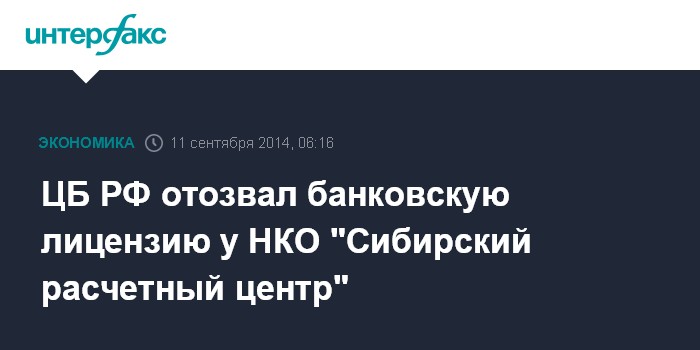 Москва. 11 сентября. INTERFAX.RU - Центральный банк РФ отозвал лицензию на осуществление банковских операций у небанковской кредитной организации "Сибирский расчетный центр" из Новосибирска.