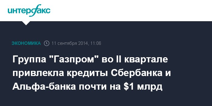 Группа "Газпром" во II квартале привлекла кредиты Сбербанка и Альфа-банка почти на $1 млрд
