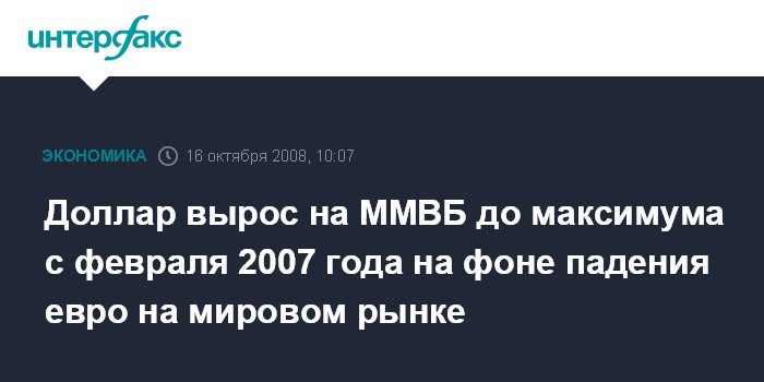 Москва. 16 октября. INTERFAX.RU - Доллар вырос в первую минуту торгов на ММВБ в четверг на 23 копейки к уровню закрытия предыдущего дня, достигнув 26,38 руб./$1 - максимальной отметки за период с февраля 2007 года.