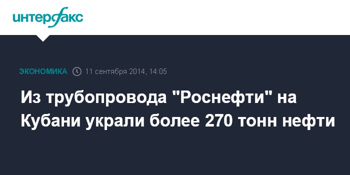 Москва. 11 сентября. INTERFAX.RU - Правоохранительные органы Краснодарского края задержали на месте преступления участников организованной группы, занимавшейся хищением нефти из трубопроводов, принадлежащих компании "Роснефть-Краснодарнефтегаз", сообщили в региональном УФСБ. Общий объем похищенной нефти с июня 2014 года составил 272 тонны на общую сумму свыше 7 млн 252 тыс. рублей.